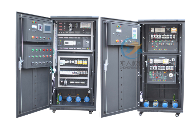 1.本裝置采用標準配電柜為主體柜,充分利用該柜雙面空間位置,其中裝有可方便拆卸的電源控制、交直流電源、測量儀表、低壓電氣器件,另一面裝有PLC模擬量模塊、變頻器、直流調(diào)速模塊、機床智能考核,該配電柜占地面積小,外形美觀;